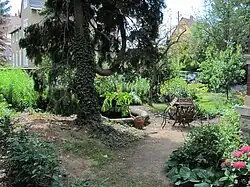 Die Einfriedung bestand bei Helas (2007) noch aus aufwendigen Holzzaunfeldern zwischen Sandsteinpfeilern mit Plattenabdeckungen,[2] die Zaunfelder wurden inzwischen (2012) jedoch zum Lattenzaun verändert.[3]