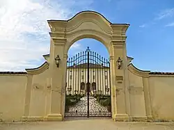 Die symmetrische Nordfassade hat, wie die gleichartige südliche, drei oberirdische Stockwerke. In der Mitte führt eine sich verjüngende Treppe, die den perspektivischen Aspekt verstärkt, zu einer mit Fresken verzierten Vorhalle mit drei Rundbögen, die von Pilastern mit dorischen Kapitellen gestützt werden. Seitlich davon und im ersten Obergeschoss hat das Gebäude rechteckige Fenster, während im Dachgeschoss sich kleine Öffnungen mit gerundeten Ecken befinden.[7]