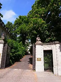 Die Villa erreicht man, indem der Torbogen eines von mehreren Wirtschaftsgebäuden durchquert wird. Es handelt sich dabei um ein versetzt angelegtes Gebäudeensemble. Es gibt die Möglichkeit, über eine Fahrstraße oder über einen Treppenaufgang die Villa zu erreichen. Von der Fahrstraße biegt ein kurviger Treppenzugang zum Plateau der Gartenanlage. Ostseits erreicht man einen Zaun, der das Grundstück von einem der öffentlichen Zugänge zur Karlshöhe abgrenzt.
