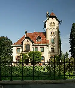 Das Duo Rhomberg/Albrich erbaute zwischen 1870 und 1910 fast alle repräsentativen Fabrikantenvillen in Dornbirn, weshalb sie auch für diesen Bau ausgewählt wurden. Der zunächst an die anderen bereits existierenden Anwesen angelehnte Entwurf wurde letztlich in Absprache mit dem Bauherrn in ein romantisches, burgartiges Gebäude mit Palas und einer Art Bergfried umgestaltet. Besonders mit dem wuchtigen Turm des Gebäudes nahmen Architekt und Bauherr Bezug auf das feudale Mittelalter.