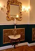 Eine mit einem roten Teppich belegte Marmortreppe im Inneren führt in die oberen Räumlichkeiten, die den Roten Salon, den Blauen Salon und den Grünen Salon umfassen. Die Treppe wird flankiert von einem schmiedeeisernen Geländer. Darüber sind Kristall-Kronleuchter positioniert. Auch in den anderen Räumen hängen Kristallleuchter.