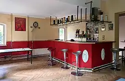 Der Rote Salon ist mit halbhohen rot-goldenen Seidentapeten bekleidet, mit rot bezogenen Stühlen bestückt (für rund 40 Besucher) und mit Parkett-Fußboden belegt, Wände und Decken sind stuckverziert, hier befindet sich der Zugang zur Terrasse.