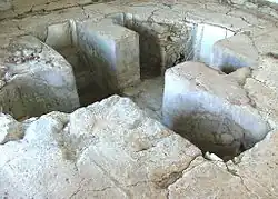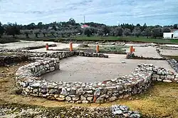 Direkt neben dem Eingang liegen die Ruinen der frühchristlichen 26 m langen Basilika mit einer kreuzförmig angelegten Taufkapelle. Starke Fundamentreste unter der Basilika lassen vermuten, dass sich dort vorher ein anderes Bauwerk befand. Der Fund von neun Münzen am Ostende des Langhauses legt für die Basilika eine Datierung nach der Mitte des 4. Jahrhunderts nahe, da die Prägedaten zwischen 335 und 357 liegen. Die Basilika wurde im 6. Jahrhundert, in westgotischer Zeit, erneuert. Dabei erhielt sie an beiden Enden je eine Apsis, ein Bautyp der in Hispanien zwischen dem 6. und dem 7. Jahrhundert fünfmal belegt ist. Im 7. Jahrhundert wurden Anbauten angefügt.[1]