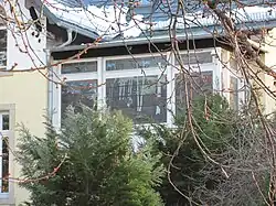In der asymmetrischen Straßenansicht nach Westen steht links ein Seitenrisalit mit Zwillingsfenstern und Krüppelwalmgiebel mit Rundbogenfenster. In der linken Seitenansicht steht von der Mitte aus nach hinten gerückt, sodass dahinter noch eine Fensterachse Platz hat, ebenfalls ein Krüppelwalmrisalit für das Treppenhaus mit einem breiteren Rechteckfenster auf halber Höhe und einem Rundbogenfenster oben. Im Winkel zwischen beiden Risaliten befindet sich eine zweigeschossige Veranda, verglast mit vollflächigen Buntglasfenstern.