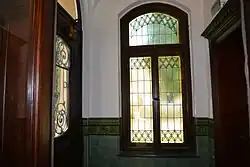 Im holzgetäfelten Foyer der Villa liegt das repräsentative zentrales Holztreppenhaus mit einer ca. 10 m hohen Kassettendecke, von dem hohe Flügeltüren in die einzelnen Räume führen, die ihrerseits mit Schiebetüren aus massivem Holz untereinander verbunden sind. In der Beletage sind die Parkettfußböden, sowie alle wandfesten Elemente, insbesondere Wandpaneele, Türen samt Beschlägen, Stuckornamente, feingliedrig gestaltete Stuckdecke, Holzfenster mit Originalverglasung, Fliesen und Bleiglasfenster vollständig erhalten geblieben; sie wurden renoviert und denkmalgerecht instand gesetzt.