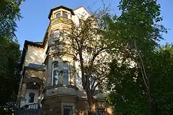 Ein turmförmiger Erker an der Nordwestecke der Villa, der über die gesamte Höhe des Hauses ragt, gibt dem Gebäude das Gepräge. Der Erker ist nach außen sechseckig gestaltet, im Inneren erweitert er die Zimmer um eine halbkreisförmige Rundung. Insbesondere in den oberen Geschossen hat man einen weiten Blick über die Dächer der Stadt bis zum Schloss Osterstein und ins Vogtland. Der Erker war ursprünglich mit einer Haube bedacht, die im Laufe der Zeit verloren gegangen ist; heute hat der Erker ein flaches Dach.