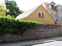 Auf der linken Seite befindet sich eine hölzerne Veranda, rechts des Gebäudes steht zur Straße hin mit dem ehemaligen Waschhaus ein eingeschossiges, giebelständiges Nebengebäude. Dieses wurde zu Wohnzwecken umgebaut.