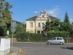 Die zweigeschossige, denkmalgeschützte[1] Villa, auch als Mietvilla eingestuft, steht auf einem Bruchsteinsockel und hat ein abgeplattetes, flachgeneigtes Schiefer-Walmdach. In der fünfachsigen Straßenansicht steht ein dreiachsiger Mittelrisalit „mit prächtigem Volutengiebel“.[1] Vor dem Risalit liegt eine Terrasse mit einem pfeilergestützten Altan, der Austritt obenauf wird durch schmiedeeiserne Ziergitter zwischen kurzen Pfeilern in der Verlängerung der unteren Stützen abgeschlossen. Die dortigen Obergeschossfenster sind in eine Pilastergliederung eingebunden. Die anderen Fenster sind durch profilierte Sandsteingewände eingefasst und durch Horizontalverdachungen im Obergeschoss und Dreiecksgiebelverdachungen im Erdgeschoss bekrönt.