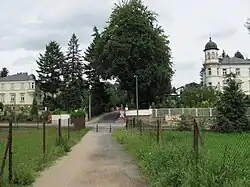 Durch zwei zillersche „Türme“ betonter Eingang in die Nizzastraße, von der Kreuzung mit dem Mühlweg und der Lößnitzgrundbahn aus; links Nizzastraße 7