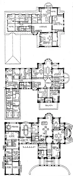 Die Halle war mit einer Kiefernholzvertäfelung ausgestattet worden, die bräunlich grau gebeizt wurde. Dort befand sich auch ein großer grüner Kamin. Dieser war mit Keramik aus den großherzoglichen Werkstätten in Karlsruhe gestaltet worden. Gepolsterte Sitzbänke machten die Kaminnische zu einem bequemen Aufenthaltsort der Halle. Ein anderer Sammelpunkt befand sich im Erker, der auf die Rosenterrasse hinaus gelegen war. Das Empfangszimmer war ganz besonders ausgestattet worden. Dort war ein großes Gemälde zu sehen, das oberhalb des Kamins angebracht worden war. Die Wände des Empfangszimmers hatten einen grau geblümten Seidenstoff als Verkleidung, der wiederum in Kirschholzumrahmungen gebracht worden ist. Auch die anderen Wände und Decke wurden mit einer Kirschholzvertäfelung versehen.