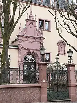An der West- und Straßenseite des Haupthauses dominiert ein reich verzierter Eingangsbereich, durch den man über eine Innentreppe in eine großzügige tonnengewölbte Treppenhalle tritt. Über dem mit Löwenköpfen, Hermenpilastern und Groteskköpfen reich verzierten und profilierten Rundbogenportal erhebt sich ein dreigeteilter Giebel, der von einem Obelisken bekrönt wird. Das Mittelfeld des Giebels nahm früher das verschnörkelte Initial „R“ für Riedel auf. Dies findet man noch auf der Nordseite des Wirtschaftsflügels in einem auf der Spitze stehenden Quadrat.