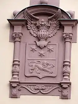 Rechts neben dem Eingangsbereich befindet sich eine Wappentafel mit einer Ädikularahmung, in der sich die halleschen Salzwirkersterne, sowie ein Löwe und ein Turnierhelm mit Adlerflügeln befinden. Vermutlich sollen diese Elemente ein Familienwappen ersetzen.