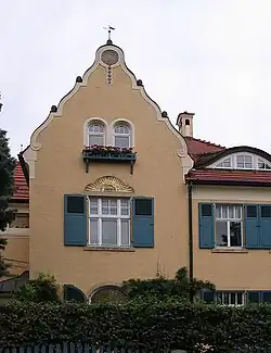 Auf der linken Seite der Straßenansicht findet sich ein Seitenrisalit mit einem hohen Schweifgiebel, in dem sich über dem Obergeschossfenster eine vergoldete Stucksonne befindet. In der linken Seitenansicht befindet sich das Treppenhaus mit einem Krüppelwalmgiebel und Knauf. Auf dieser Seite ist auch der Eingang zu finden, der von einem geschweiften, säulengestützten Vordach geschützt wird. Auf der Rückseite des Hauses ist eine massive Veranda.