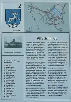 Die Villa Schmidt am Landsbergplatz 5 ist Zeugnis der neueren Geschichte Drensteinfurts und erinnert an die münsterländische Strontianit-Bergbauzeit von circa 1871 bis 1885. Die Villa Schmidt wurde vom einstigen Strontianit-Grubenbesitzer Peter Schmidt erbaut.[3] Ein Relief an der Haustür und Mosaikfliesen im Flur sowie die für Drensteinfurt auffallende Architektur der Villa sind ein deutliches Zeichen der kurzen Blütezeit des Bergbaus und des wohlhabenden Lebensstils der „Bergbau-Barone“. Das in Europa seltene kristalline Mineral Strontianit (SrCO3) wurde zur Gewinnung von Zucker (z. B. aus Zuckerrüben) gebraucht. Der Strontianit-Bergbau, der zu einer Phase wirtschaftlichen Aufschwungs und Reichtum in Drensteinfurt führte, nahm gegen Ende des 19. Jahrhunderts relativ rasch ab, weil Strontianit durch das häufiger gefundene und kostengünstigere Coelestin (SrSO4) ersetzt wurde, das die gleiche rhombische Kristallstruktur hatte und daher gleichwertig wirkte. Der Strontianit-Bergbau nahm somit ein schnelles Ende.[1]