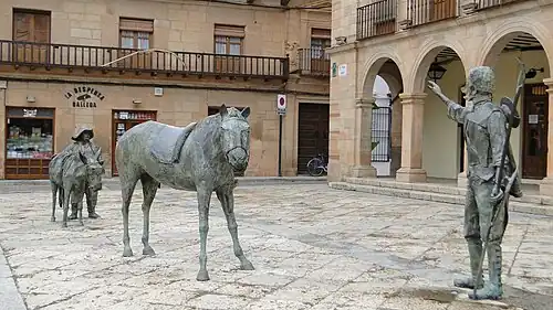 - Zentrum der Stadt ist die Plaza Mayor mit zahlreichen Bauten des 15. bis 18. Jahrhunderts. Hier steht auch ein ebenerdiges Bronzedenkmal für Don Quijote und sein Pferd Rosinante, denen mit ein paar Metern Abstand sein Knappe Sancho Pansa in Begleitung seines Esels Rucio folgt.