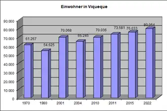 In Viqueque leben 80.176 Menschen (2022,[2] 2011: 73.581 Einwohner[11]), davon sind 40.363 Männer und 39.813 Frauen. Auf 101 Männern kommen 100 Frauen[2] Der Altersdurchschnitt liegt bei 18,5 Jahren. Durch die starke Abwanderungsbewegung in die Landeshauptstadt Dili hat Viqueque mit 0,8 % das niedrigste jährliche Bevölkerungswachstum aller Gemeinden Osttimors.[2] Zwischen 1990 und 2004 wuchs die Zahl der Einwohner jährlich noch um 0,95 %. Hatte 2004 in Lacluta jede Frau durchschnittlich 5,92 Kinder, stieg die Anzahl in Viqueque auf 6,20, in Uato-Lari auf 6,54 und 7,20 Kinder in Ossu, bis auf 7,26 Kinder pro Frau in Uatucarbau an (Landesdurchschnitt 6,99). Die Kindersterblichkeit lag 2002 in Uatucarbau bei 85 Todesfällen pro 1000 Lebendgeburten (1996:144), in Viqueque bei 108 (138), in Uato-Lari bei 110 (139), in Ossu bei 131 (137) und in Lacluta bei 143 (122). Uatucarbau kann somit auf einen der stärksten Rückgänge der Kindersterblichkeit in den letzten Jahren verweisen. Es ist aber das einzige Verwaltungsamt Viqueques, der damit unter dem Landesdurchschnitt von 98 liegt. Ossu und Lacluta gehören zu den acht Verwaltungsämtern Osttimors mit der höchsten Kindersterblichkeit. In Lacluta stieg sie entgegen dem Landestrend zwischen 1996 und 2002 sogar um 17 % an.[12]