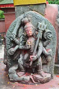 Virabhadra ist ein Sohn des hinduistischen Gottes Shiva. Nach dem Mythos hatte sich die erste Gemahlin Shivas Sati selbst verbrannt, um die Ehre ihres Mannes wiederherzustellen, nachdem beide von ihrem Vater Daksha nicht zu einer großen Opferfeier eingeladen worden waren. Shiva fühlte sich davon herausgefordert, riss ein Haar aus seinen Locken und warf es auf den Boden. Daraufhin erhob sich vom Boden ein großer Held, Virabhadra. Ihm wurde gesagt, er solle Shivas Heer gegen Daksha führen und die Opferfeier stören. Virabhadra und sein Heer zerstörten das Opfer und enthaupteten Daksha.[4]
