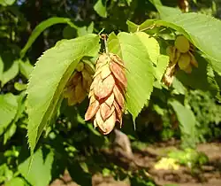 Die zapfen-, hopfenähnlichen Fruchtstände, daher der Trivialname, sind 3,5 bis 6,5 Zentimeter lang und haben Durchmesser von 2,0 bis 2,5 Zentimeter. Sie bestehen aus mehreren einzelnen, elliptisch bis eiförmigen, stachelspitzigen, flachen Deckblättern, welche 1,0 bis 1,8 Zentimeter lang und 0,8 bis 1,0 Zentimeter breit sind. Die Deckblätter sind anfangs hellgrün, später hellbraun und trocken, papierartig, sie umhüllen sackartig, flügelig (Flügelfrucht, Pterometeorochorie) jeweils eine etwa 7 Millimeter lange und etwa 4 Millimeter breite, anfänglich gelblich-grüne, später braune, eiförmige Nuss. Die Schale besitzt ein papieriges Tegmen (Innenseite der Samenschale oder Testa).[5]