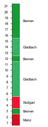 | 4. Borussia Mönchengladbach | 21 | 15 | 1 | 5 | 101:70 | +31 | 108 |
