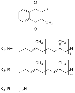 Bei Vitamin-K handelt es sich um fettlösliche Substanzen, sogenannte Vitamere. Allen gemeinsam ist das Grundgerüst 2-Methyl-1,4-Naphthochinon (Menadion), das an der C3-Position unterschiedlich substituiert ist.[10] Voraussetzungen für die Vitamin-K-Aktivität sind neben dem unsubstituierten, aromatischen Ring die Methylgruppe; die lipophile Seitenkette (die je nach K-Vitamin unterschiedlich lang sein kann) bestimmt die Fettlöslichkeit und andere Eigenschaften.[11] Optimal sind natürliche Terpenketten mit 20 Kohlenstoffatomen. Seitenketten unter 8 Kohlenstoffatomen führen außer bei Menadion zur Inaktivität.