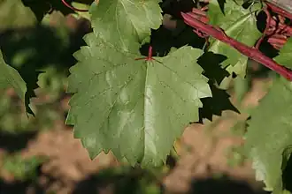 • Die kleinen, dicken Blätter sind meist nierenförmig, d. h. breiter als lang. Die Stielbucht ist klammerförmig offen. Das Blatt ist stumpf gezahnt. Die Zähne sind im Vergleich der Rebsorten mittelweit angeordnet.