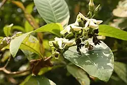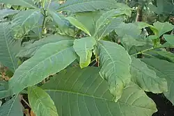 Die gegenständig an den Zweigen angeordneten Laubblätter sind meist ungestielt (= sitzend)[2][3][4][5] oder seltener kurz gestielt. Wenn ein Blattstiel vorhanden ist, dann ist er kahl bis flaumig behaart und bis zu 2 Zentimeter lang. Die Blattstiele eines Blattpaares sind zu einer kurzen Ochrea verwachsen, die sich nicht in Intrapetiolarstipeln verbreitert.[1] In den Blattachseln sind Drüsen[2][3][4][5] in Form einer Reihe von Kolleteren vorhanden.[1] Die Blattspreiten sind in Form und Größe relativ veriabel. Die einfache und ganzrandige Blattspreite ist bei einer Länge von meist 15 bis 17 Zentimetern[2][3][5] (7 bis 41,5 Zentimetern[1]) sowie einer Breite von 3 bis 20 Zentimetern[1] 1,5- bis 3,5-, selten bis zu 4-mal so lang wie breit und schmal- bis breit-elliptisch[1] bis verkehrt-eiförmig[2][3][5] mit keilförmiger oder herablaufender Spreitenbasis[1] und zugespitztem[7] oder bespitztem,[2][3][4][5] selten stumpfem[1] oberen Ende. Die Blattoberseite ist dunkelgrün und glänzend, die Unterseite ist heller grün als die -oberseite.[7] Zur Blütezeit ist die Blattspreite meist hellgrün und zur Fruchtzeit etwas dunkler. Frisch sind die Blattspreiten häutig und getrocknet pergamentartig.[1] Beide Blattseiten sind in der Regel kahl, die Unterseite oder die untere Mittelrippe können flaumig behaart sein. Auf beiden Seiten der Mittelader sind 8 bis 22 Seitennerven und die weitere Nervatur ist kaum erkennbar.[1]
