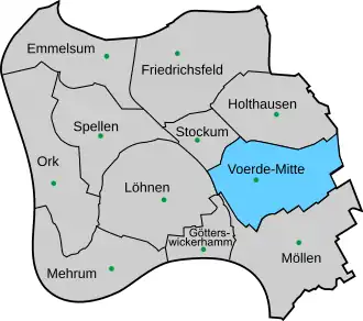 Das Stadtgebiet gliedert sich gemäß § 1 Abs. 3 der Hauptsatzung in die elf Stadtteile Götterswickerhamm, Löhnen, Mehrum, Möllen, Voerde, Stockum, Holthausen, Friedrichsfeld, Emmelsum, Spellen und Ork. Die Stadtteile sind jedoch keine Ortschaften im Sinne des § 39 GO NW.