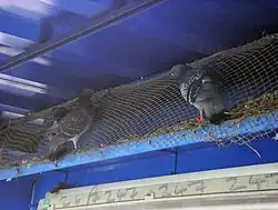 • Jede Stadttaube produziert pro Jahr zehn bis zwölf Kilogramm Kot, der ätzend wirkt und nicht nur historische Bausubstanz, sondern auch Stahlkonstruktionen schädigen kann.[21] Durch Nistmaterial und Kot verstopfte Dachrinnen können zu Durchfeuchtungen führen.