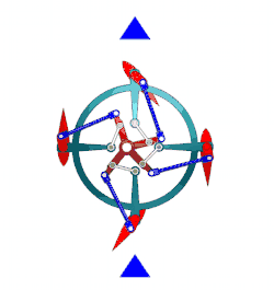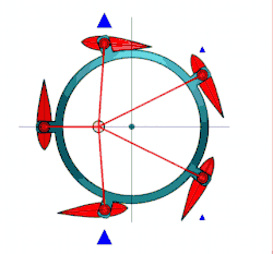 - Prinzipiell kann aber auch ein Fahrzeug angetrieben werden, wenn die Rotation des VSP (beliebige Drehachse) nicht im Wasser, sondern in Luft stattfindet (das trifft für Wasser-, Land- oder Luftfahrzeuge zu). An entsprechenden Luftfahrzeugen experimenteller Natur wurde und wird bereits seit Beginn des 20. Jahrhunderts gearbeitet (gegenwärtig in verstärktem Maße unter den Bezeichnungen Cyclocopter, Cyclorotor oder Cyclogyro)[7][8][9]. Im Gegensatz zur oben genannten indirekten Verwendung des VSP für die Realisierung eines Luftfahrzeugs (Flettnerrotor-Anströmung mit VSP-Gebläse) erfordert die direkte Nutzung eines VSP für die Auftriebs- bzw. Vortriebserzeugung eines Fluggerätes jedoch ggf. sehr hohe Drehzahlen (Problem: Beherrschung von Unwuchten).