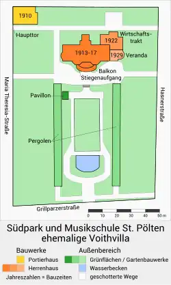 Die ehemalige Voithvilla in St. Pölten war das Wohnhaus des Industriellen Walther Voith und steht heute (Listeneintrag), mitsamt Pförtnerhaus (Listeneintrag), Umfriedung und Gartenpavillon (Listeneintrag), unter Denkmalschutz. Der neobarocke Herrenhauskomplex entstand in den Jahren 1910 bis 1917 und wurde 1922 und 1929 erweitert. Heute ist die Villa im Eigentum der Stadt St. Pölten, in ihr ist das Kulturheim Süd untergebracht,[1] die Parkanlage ist öffentlich zugänglich und wird Südpark genannt.[2]