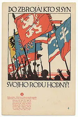 Ein Bestandteil von Preissigs Anwerbungskampagne für den Nationalrat waren sogenannte militärische Plakate und Postkarten, die der Rekrutierung von Freiwilligen gewidmet waren. Hohe Auflagen erzielten seine sehr beliebten militärischen Postkarten aus dieser Zeit.[10] In den Jahren 1916–1918 schuf Preissig eine Serie von insgesamt dreizehn Werbeplakaten und anderer Drucke für die tschechoslowakischen Legionen in Frankreich. Sie erschienen in tschechischer und slowakischer Sprache. Ähnliche Motive wie auf den Plakaten wurden für einen Satz von 16 Militärpostkarten verwendet. Im Jahr 1918 wurden sie in insgesamt vier Ausgaben in unterschiedlichen Sprachen veröffentlicht, unter anderem mehrere Tausend Karten in Tschechisch und Italienisch. Die Plakate und Postkarten wurden in langen und ausführlichen Diskussionen mit Mitgliedern des Nationalrates besprochen und abgestimmt. Preissig schuf auch eine spezielle Art von Buchstaben für seine Plakate – die sogenannte "Plakatschrift".[1][5][9]