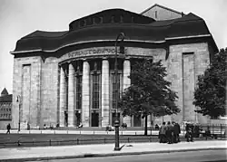 Später wurde ein gemeinsames Haus der wiedervereinten Freien Volksbühne und der Neuen Freien Volksbühne erbaut. Durch Spenden der Mitglieder, sogenannte „Arbeitergroschen“, konnten beträchtliche Summen aufgewendet werden, um mit dem Bau eines Theaters zu beginnen. Von 1913 bis 1914 wurde es nach Plänen des Architekten Oskar Kaufmann im Scheunenviertel am damaligen Bülowplatz unweit des 1891 abgerissenen Victoria-Theaters errichtet. Als erstes Theater Berlins präsentierte es sich im Stil der Moderne und war für etwa 2000 Personen ausgelegt.[5] Die Eröffnung erfolgte am 30. Dezember 1914.[6] Der zweite Intendant der Volksbühne am Bülowplatz, der heute Rosa-Luxemburg-Platz heißt, war von 1915 bis 1918 Max Reinhardt. Sein Nach-Nachfolger Fritz Holl engagierte den Theaterreformer Erwin Piscator, der mit seinen Arbeiten als Oberspielleiter der Volksbühne von 1924 bis 1927 zum Begründer des politischen Theaters wurde. So setzte Piscator Satireabende, Sprechchorwerke und politische Revuen im Auftrag der KPD in Szene, in denen er erstmals den Einsatz filmischer Mittel erprobte.