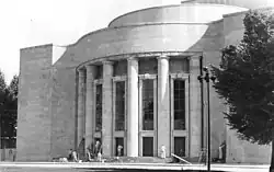 Nach schweren Kriegszerstörungen und einer Zwischennutzung der Fläche vor dem Gebäude als Platz für die Berliner Trümmerbahn begann der Wiederaufbau des Hauses. Dazu wurde 1948 ein Wettbewerb organisiert, nach dem vorerst moderne Formen verwendet wurden, wie sie die seitlichen Anbauten dokumentieren. Bis zur Fertigstellung wurde zwischen 1947 und 1953 durch das Ensemble der Volksbühne, unter der Intendanz von Heinz Wolfgang Litten und Fritz Wisten, das Theater am Schiffbauerdamm und der Prater im Stadtbezirk Berlin-Prenzlauer Berg bespielt.[7] Der Wiederaufbau von 1952 bis 1954 nach einem Entwurf von Hans Richter hatte zum Ziel, „[…] unter weitgehender Benutzung des alten Mauerbestandes ein neues Theater zu bauen.“ Die Wiederherstellung der Umfassungsmauern mit der monumental geschwungenen Hauptfront mit sechs Muschelkalksäulen verzichtete auf den bildkünstlerischen Schmuck von Franz Metzner, behielt aber die äußere Form bei. Anstelle der Kupferhaube und des Dachtambours wurden Flachdächer errichtet, somit erhielt das Bühnenhaus einen geraden Abschluss. Durch die Begradigung der elegant schwingenden Linien der Dachlandschaft erhielt der Baukörper eine wuchtigere stadträumliche Wirkung.