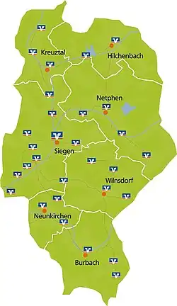 Das Geschäftsgebiet umfasste die Städte Siegen, Kreuztal, Netphen und Hilchenbach, die Gemeinden Neunkirchen, Burbach und Wilnsdorf in Nordrhein-Westfalen sowie Mudersbach in Rheinland-Pfalz.