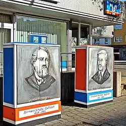 Schulze-Delitzsch und Raiffeisen auf Stromkästen an Kochs Ecke
