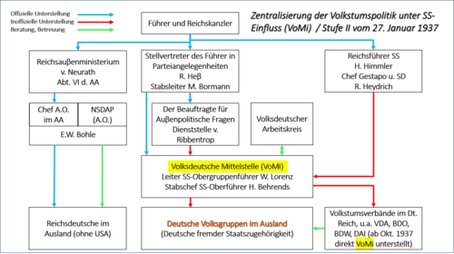 Die Volksdeutsche Mittelstelle (VoMi), geleitet von SS-Obergruppenführer Werner Lorenz, wurde ursprünglich 1936 als Instrument nationalsozialistischer Außenpolitik ins Leben gerufen. Das Ziel der Organisation war, die „Volksdeutschen“ im Ausland finanziell und politisch zu unterstützen und gleichzeitig für die NS-Volkstumspolitik zu instrumentalisieren, zusammen mit der Ernennung nationalsozialistisch orientierter „Volksgruppenführer“, die oftmals im Geiste des Nationalsozialismus und der SS in Deutschland geschult waren.[8] Den „Volksgruppenführungen“ oblag auch die Jugendarbeit.[9] Das Bestreben der VoMi war es, auf Basis des „Führerprinzips“ und der „Volksgemeinschaft“ durch „Gleichschaltung“ der Institutionen der Deutschen Volksgruppe im jeweiligen Gastgeberland solche „Volksgruppenführer“ aufzubauen und durchzusetzen, die einerseits den Anordnungen der VoMi und des Außenamtes gegenüber gefügig waren, anderseits aber in ihrer minderheitlichen „völkischen“ Politik ihre mit dem Deutschen Reich oft verbündeten Heimatstaaten nicht brüskierten oder verärgerten.[10] In diesem Sinne wurden auch sämtliche Hilfsorganisationen gleichgeschaltet, die bis dahin mit Auslandsdeutschen zusammengearbeitet hatten.[8] Bis 1942 baute der Reichsführer SS Heinrich Himmler, nun auch Reichskommissar für die Festigung deutschen Volkstums, die VoMi zu einem SS-Hauptamt aus, dem ab September neben der Volkstumspolitik, der Betreuung der Deutschen Volksliste, der Absiedlung, dem Transport und der Versorgung von Umsiedlern nun auch offiziell die „Führung der deutschen Volksgruppen mit fremder Staatsangehörigkeit“ zufiel. Die deutschen Volksgruppen verloren damit ihre Eigenständigkeit und gerieten unter das Kommando reichsdeutscher nationalsozialistischer Amtswalter.[11]