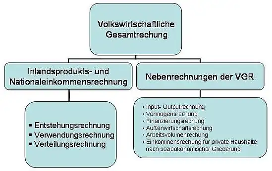 „Die Volkswirtschaftliche Gesamtrechnung verfolgt das Ziel, das Wirtschaftsgeschehen einer Volkswirtschaft für einen zurückliegenden und daher abgeschlossenen Zeitraum quantitativ möglichst umfassend zu beschreiben.“[1] Die ermittelten Werte werden in Form eines Kontensystems erfasst und in Form von Tabellen dargestellt.