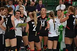 Der Kader einer Volleyballmannschaft besteht meistens aus zwölf Spielern, manchmal auch mehr. Auf dem Spielberichtsbogen ist pro Mannschaft Platz für die Eintragung von vierzehn Spielern.[16] Jeweils sechs Spieler stehen gleichzeitig auf dem Feld.[16] Die sechs Spieler der Startaufstellung bezeichnet man auch als Starting Six. Die Spieler einer Mannschaft tragen die gleichen Trikots. Eine Ausnahme bildet dabei der Libero, für den einige Sonderregeln gelten (siehe unten). Ein Spieler wird zum Kapitän der Mannschaft ernannt.[17] Nach einer Regeländerung darf seit Anfang 2022 auch der Libero dieses Amt übernehmen.[18] Der Kapitän führt nicht nur seine Mitspieler, sondern ist auch für die Kommunikation mit dem Schiedsgericht und Formalitäten wie das Unterschreiben des Spielberichts zuständig.[19] Der Trainer ist neben der Betreuung seiner Mannschaft unter anderem für die Aufstellung, Auswechslungen und Auszeiten verantwortlich.[19] In seiner Arbeit wird er häufig von einem Co-Trainer unterstützt.[19] Weitere Offizielle, die während des Spiels auf der Bank sitzen können, sind der Mannschaftsarzt und der Physiotherapeut.[16]