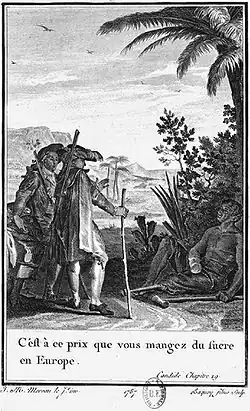 Bei Voltaire finden sich auch dezidiert kritische Äußerungen zur Sklaverei. So unter dem Stichwort „Esclaves“ in den Questions sur l’Encyclopédie von 1771.[57] Auch schildert er eindrücklich die Verstümmelungen des Sklaven von Surinam im Candide, die in der Ausgabe Kehl durch einen Stich Jean-Michel Moreaus illustriert wird. Im Commentaire sur l'Esprit des lois (1777) lobt Voltaire Montesquieu für die Verwerfung der Sklaverei. Voltaire hat begeistert die Haltung der Quäker in Pennsylvania kommentiert, die eine Abschaffung der Sklaverei vertraten und auch durchsetzten.[58] Den Krieg des Spartacus nannte er gerecht, wenn nicht sogar den einzigen gerechten Krieg.[59] In den letzten Jahren seines Lebens setzte sich Voltaire zusammen mit dem befreundeten Juristen Charles-Frédéric-Gabriel Christin für die Beendigung der Leibeigenschaft im Jura ein, in dem das Recht der Toten Hand überdauert hatte.[60] Im Französischen Recht schloss der Terminus Mainmorte auch die Person des Serfs ein. Voltaire erreichte sein Ziel nicht; die Leibeigenen der Franche-Comte wurden erst 1790 in der folgenden Französischen Revolution befreit.