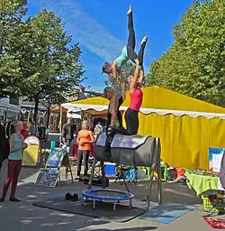 Das breitensportliche Voltigieren kann als Einstieg in den Reitsport genutzt werden, bietet jedoch auch eine gute Vorbereitung auf den Turniersport.[4] Für Einsteiger- und Anfängergruppen (auch Nachwuchsgruppen genannt) sowie teilweise auch für Einzelvoltigierer gibt es auf Landes- und Kreisebene Wettbewerbe, die ganz oder teilweise im Schritt durchgeführt werden.