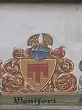 - schwarz befransten Lätzen versehene rote Montfortische Banner,