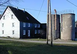 Auf einer Anhöhe nahe der Hofschaft wird eine Windkraftanlage betrieben.