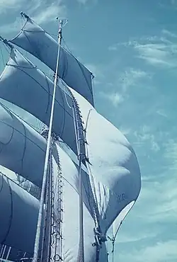 - Jager oder Flieger: Der Jager als größtes Vorsegel wird auf dem vordersten Stag eines Schiffes gefahren, seine Vorderkante wird entlang des äußersten Stags hochgezogen; dieses Stag reicht vom äußersten Ende des Klüverbaums bis nahe zur Spitze der obersten Verlängerung (Stenge) des vordersten Mastes. Aufgrund seiner Größe wird der Jager nur bei leichtem Wind gesetzt. Bei etwas stärkerem Wind kann an der gleichen Stelle stattdessen ein Flieger gesetzt werden. Dieser wird allerdings nicht am Stag befestigt, sondern „frei“ zwischen dem Klüverbaumende und der Stenge gespannt. Weil der Flieger kürzer als die Strecke zwischen Klüverbaum und Stenge ist, wird der Flieger weiter hinaufgezogen, so dass das Segel hoch über dem Klüverbaum und dem Großteil der übrigen Segel „fliegt“.