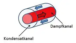 Durch externe Wärmezufuhr verdampft das Kondensat und bewegt sich als Gas durch o. g. Struktur ins Innere der Heatpipe, den Dampfkanal, über welchen es anschließend in den Kondensationsbereich gelangt. Dort, an einer Wärmesenke, bildet die Trennwand, wiederum als nichtbenetzbare poröse Struktur ausgebildet, die Übergangsstelle zum Kondensationsbereich. Durch Druck- oder Konzentrationsgefälle diffundiert das Gas nach außen und tritt mit den Außenwänden der Heatpipe in Berührung. An dieser Stelle wird Wärmeenergie abgegeben; der Dampf kondensiert. Hier besteht für das Kondensat aufgrund seiner großen Oberflächenspannung nur die Möglichkeit des Rückflusses durch den Kondensatkanal (Kapillarwirkung), an dessen Ende, am Ort der Wärmequelle, der Temperaturkreislauf durch äußere Wärmezufuhr wieder von Neuem beginnt.