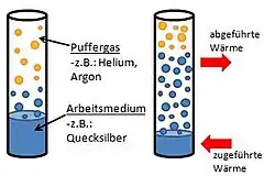 Nach Befüllung mit dem wärmetransportierenden Medium und Evakuierung überschüssiger Gase wird ein definierter Innendruck durch zusätzliche Befüllung der Heatpipe mit einem Gas eingestellt, dem sogenannten Puffergas. Dieses bildet innerhalb der Heatpipe eine Pufferzone, in welche das Arbeitsmedium nicht eindringen kann. Wichtiges Kriterium für die Wahl dieses Puffergases muss sein, dass es unter keinen Umständen im späteren Arbeitsbereich chemische Reaktionen mit der Heatpipe oder mit dem wärmetransportierenden Medium eingehen darf. Beispielsweise ließe sich bei der Nutzung des Arbeitsmediums Quecksilber ein reaktionsträges Puffergas wie Argon oder Helium verwenden.
