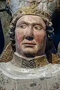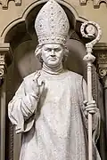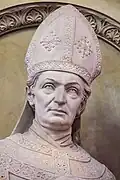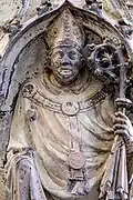 | 20 | Hl. Adalbero | 1045 | 1085 | Adalbero, von dem Salier Heinrich III. als Bischof eingesetzt, war bis Anfang 1076 ein Anhänger der Salier. Im Investiturstreit zwischen König Heinrich IV. und Papst Gregor VII., war Adalbero ein überzeugter Anhänger von Papst Gregor VII. Im Frühjahr 1085 wurde Adalbero von der Mainzer Synode als Bischof von Würzburg exkommuniziert und abgesetzt, seit 1077 war er jedoch nicht mehr im königstreuen Würzburg. Wegen seiner Überzeugungen ins Exil getrieben, verbrachte er seine letzten Jahre im Kloster Lambach. Die nach seinem Tod im Okt. 1090 überlieferten Wunder führten 1883 schließlich zu seiner Heiligsprechung. Das Bild zeigt Adalbero als plastische Figur auf seinem Epitaph. | ![]() Epitaph des Bischofs |