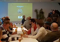 Der Archäologe Jens Berthold (rechts) stellt den Bürgern in Riehe die Untersuchungsergebnisse vor, 2019
