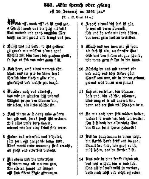 Der Text war auch in einem Druck von 1561 enthalten: Ein Gebett g°ut=||hertziger leüt gemeiner Eid=||gnoschafft/ z°u Gott/ durch || Christum/ vmb einen g°uten || Landfride/ mit angehenck=||ter Clag ab gemeiner welt || vnb°ußfertigkeit/ vnd ver=||manung z°u ylender || besserung. Er trägt dort die Überschrift Ein gebät gemeiner Christ gleubigen wider ihre Find. Darin findet sich auch die Vorlage zur EG-Strophe 7.[4]