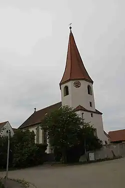 Der Kirchturm der evangelisch-lutherischen Kirche St. Hieronymus wurde im 18. Jahrhundert aufgestockt und wird von einem Spitzhelm gekrönt. Das dreiachsige und von Strebepfeilern gegliederte neugotische Langhaus wurde 1870 vom Architekten Wilhelm Langenfaß errichtet. Die Westfassade wurde mit einem Türgewände, einem Fenster mit Wimpergabschluss und einer Fensterrose verziert. Die Kirche orientiert sich an der St.-Willibalds-Kirche in Weißenburg in Bayern.[6]