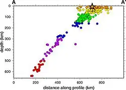In Wadati-Benioff-Zonen werden Erdbebenherde bis in 700 km Tiefe nachgewiesen, wobei die Herde auf einer geneigten Fläche angeordnet sind. Die Erdbebenherde zeichnen die Lage der in den Erdmantel absinkenden, subduzierten tektonischen Platte nach. Das im Gegensatz zum Oberen Mantel relativ kühle Material der abtauchenden Platte bewahrt lange Zeit seine Fähigkeit, die durch die Subduktion entstehenden Spannungen im Gestein durch Sprödbruch abzubauen, was sich jedes Mal in einem Erdbebenereignis zeigt.[2]